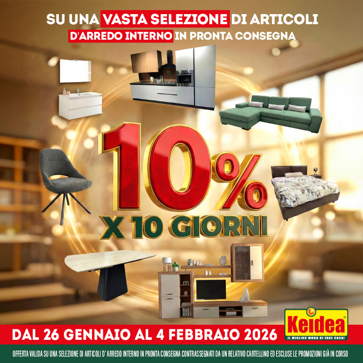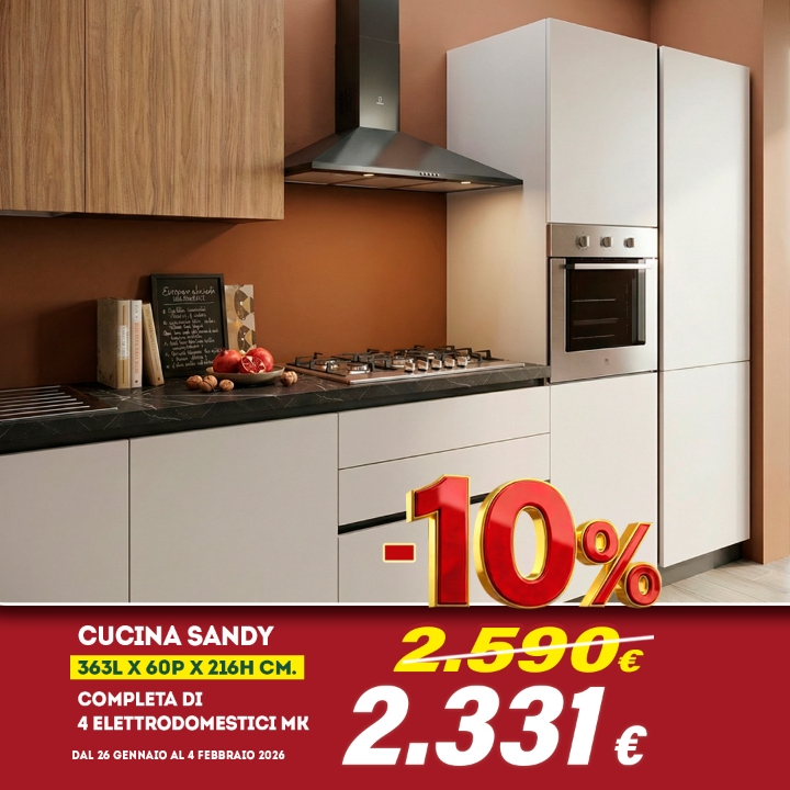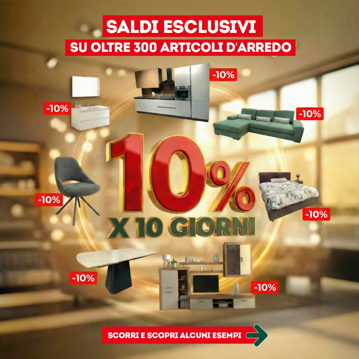 OFFERTE VALIDE SALVO ESAURIMENTO SCORTE. OFFERTE NON CUMULABILI CON ALTRE PROMOZIONI IN CORSO. SALVO ERRORI E/O OMISSIONI. PROMOZIONI ESCLUSO DI TRASPORTO E MONTAGGIO. PER LE CAMERE E CAMERETTE, SONO ESCLUSI RETE E MATERASSI. LE IMMAGINI RIPORTATE HANNO VALORE PURAMENTE ILLUSTRATIVO.